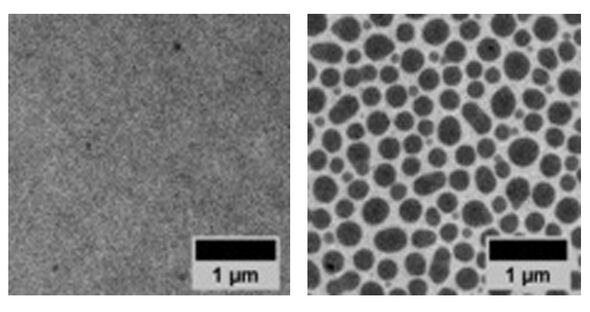 Bovenstaande afbeeldingen laten het verschil zien tussen de situaties met druppels en zonder druppels onder de elektronenmicroscoop. Bron: TU/e