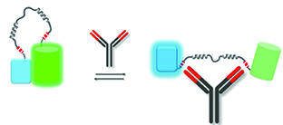 De sensoreiwitten van Merkx zijn samengesteld uit twee lichtgevende eiwitten. De ene helft van de sensor geeft blauw licht af, wat door de andere helft wordt geabsorbeerd en vervolgens als groen licht wordt uitgezonden. Als zo’n sensoreiwit een antilichaam van het juiste type tegenkomt (voor elke ziekte heb je een ander sensoreiwit nodig), dan vormen beide moleculen een verbinding. Het gevolg is dat de twee delen van het sensoreiwit uit elkaar worden getrokken en het blauwe licht niet langer wordt omgezet in groen. Van buitenaf is daardoor onder invloed van de antilichamen een verkleuring van groen naar blauw zichtbaar (zie afbeelding).
