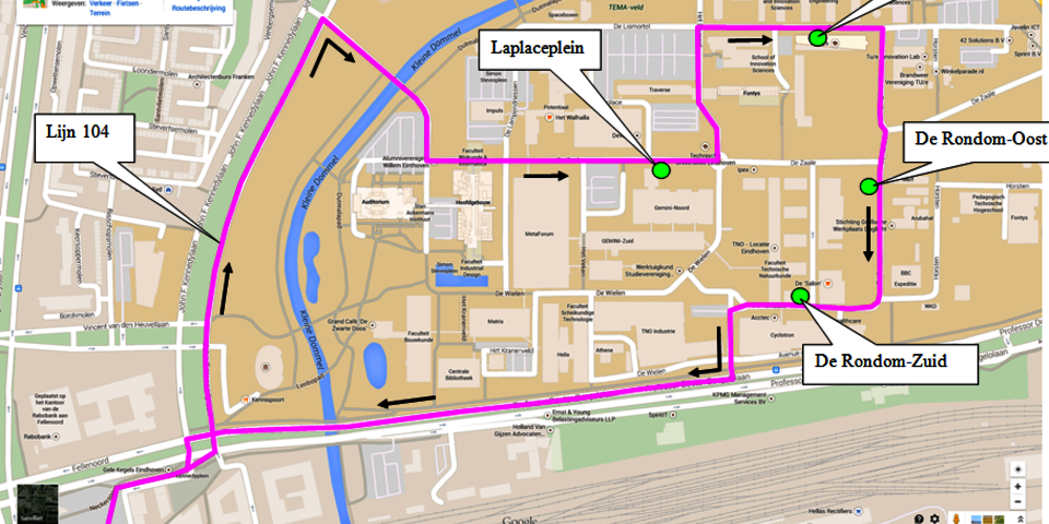 De nieuwe bus krijgt het nummer 104 mee en koerst straks officieel naar ‘TU/e Science Park’. Vanuit busstations Neckerspoel rijdt hij de campus via de ingang aan de Kennedylaan op. Na de slagbomen draait hij links De Zaale op, om op de rotonde bij het Laplaceplein opnieuw linksaf te slaan. Bij De Lismortel gaat het rechtsaf om passagiers op het noordoosten van de campus af te zetten of op te halen. Via De Rondom-Oost en –Zuid wordt de bedrijvenzone en Flux bediend om daarna de campus via de uitgang bij TNO te verlaten. Over de Dorgelolaan worden de passagiers weer teruggebracht naar Neckerspoel. De bus rijdt dus altijd maar in één richting het terrein over. De eenrichtingssituatie op De Lismortel gaat omdraaien. De bus (en ook de auto's) rijden binnenkort vanaf de westkant (Het Eeuwsel) De Lismortel op in plaats van andersom.