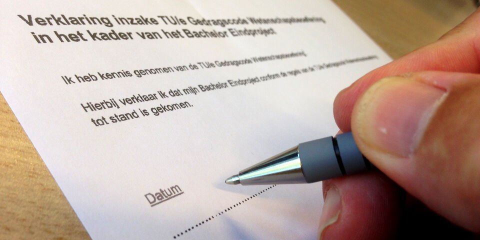 Vorige week besloot het College van Bestuur dat de eigen gedragscode die de TU/e vorig jaar opstelde naar aanleiding van het verschijnen van de Gedragscode Wetenschapsbeoefening van VSNU, ook door alle nieuwe masterstudenten moet worden ondertekend. Ook aan het bachelor-eindproject, de masterscriptie, het PDEng-rapport en het proefschrift moet met ingang van 1 september een getekende verklaring toegevoegd worden. Bij de ondertekening van de verklaring dient de mentor aanwezig te zijn, die in zijn gesprekken met de student ook aandacht dient besteden aan het onderwerp wetenschappelijke integriteit, staat in de brief die 25 juni werd gestuurd naar faculteitsbesturen, opleidingsdirecteuren en examencommissies.