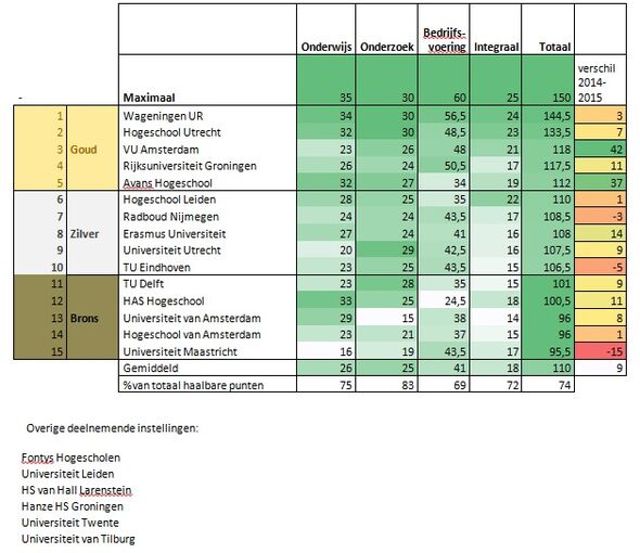 De lijst is dan ook opgedeeld in drie categorieën. De vijf instellingen met de meeste punten zijn ‘goud’, dan komen ‘zilver’ en ‘brons’. De TU/e bezette in 2013 en 2014 respectievelijk de vijfde en vierde plaats, posities die goed waren voor het predikaat 'goud', maar moet dit jaar genoegen nemen met zilver.