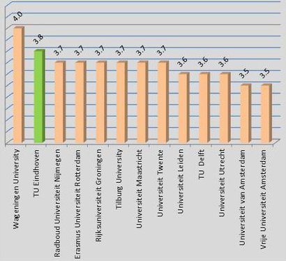 Van de dertien reguliere universiteiten krijgt de TU/e na de Wageningen UR gemiddeld de hoogste beoordeling. Volgens de opstellers van de enquête zijn studenten in Nederland gemiddeld tevredener dan ooit over hun opleiding.