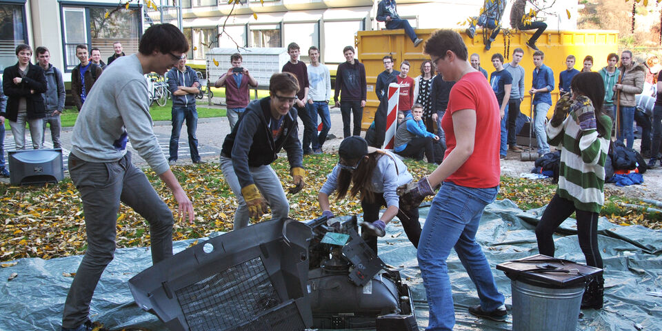 De beste stuurlui staan aan wal - ook deze maandagmiddag nabij de Dommel. Met de nodige decibellen en woeste armgebaren moedigen omstanders de groepjes eerstejaars Electrical Engineering aan die hun tentamen-ergernissen mogen botvieren op logge tv’s van voor het flatscreentijdperk.