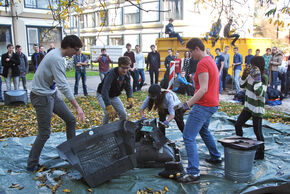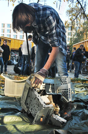 Ook kon de studievereniging in haar nieuwe onderkomen niet, zoals voorheen, eindeloos de lijvige, lompe televisies opslaan die ze voor het jaarlijkse destructieve feestje nodig heeft. De activiteitencommissie wist echter een tijdelijk lokaaltje in het Paviljoen te ritselen waar het de afgelopen tijd beeldbuizen hamsterde, “afkomstig van Marktplaats en Thor-leden”.
