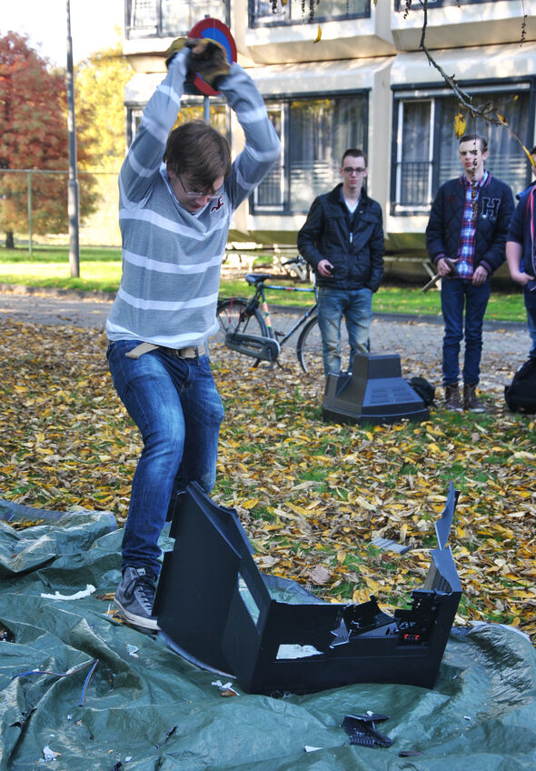 En zo worden maandagmiddag traditiegetrouw een kleine twintig televisies tot moes geslagen met hamers, fietskettingen en al wat er verder aan gereedschap voorhanden is. De missie: zoveel mogelijk kilo's aan compacte rommel overhouden en deze door een gat van zeven bij zeven centimeter zien te proppen. Veiligheidsbrillen en handschoenen zijn dit jaar voor het eerst verplichte accessoires. Want, zo bekent Janssen: “We mogen het eigenlijk afkloppen dat het nog nooit is misgegaan”.