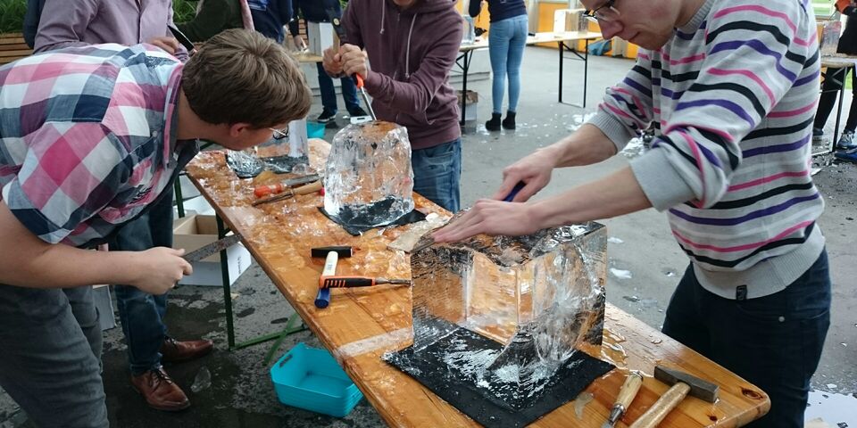 De workshop ijssculpturen maken was een activiteit van studievereniging Van der Waals (Technische Natuurkunde) in het kader van het 55-jarig bestaan van de vereniging. Beeldend kunstenaar Madeleine van Drunen verzorgde de workshop namens Kunstgras Events. “Je heb hooguit een uur of drie voordat het ijs is gesmolten”, waarschuwde ze. “Vergeet vooral niet om tussendoor foto’s te maken.” Want een tastbaar bewijs van hun creatieve activiteiten konden de studenten uiteraard op hun buik schrijven.