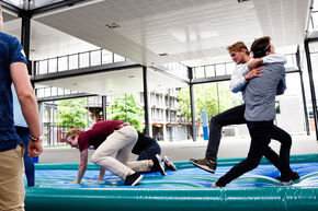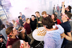 Na de academische plechtigheden werd het collegejaar 2015/2016 vrijdagavond afgesloten met een feest. Dat gebeurde onder de overkapping van de Markthal -en niet bij Flux- vanwege het slechte weer. Gratis ijs, een polaroidfoto die recht gaf op een cocktail, elektronische dansmatten en een enorme opblaasdansvloer, droegen bij aan de sfeer. De opkomst viel een beetje tegen.