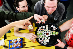 Tussen de 150 feestgangers in de Markthal zit na 21.00 uur nog een enkele verdwaalde docent. Emiel van Berkum (Wiskunde & Informatica) neemt even pauze van zijn tentamencorrecties en eet een frietje. De studenten die hij gadeslaat hebben het goed naar hun zin. De meeste collega’s die er vanavond waren zijn vertrokken na het onderdeel ‘Professors on Stage’.