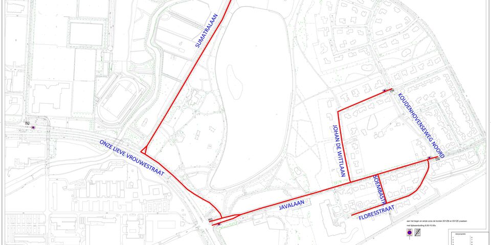 Op het kaartje is te zien waar tot 1 oktober 2016 niet meer geparkeerd mag worden tussen 8.00 en 10.00 uur. Het betreft de ventweg aan de noordelijke zijde van de Onze Lieve Vrouwestraat, gelegen tussen de Javalaan en Sumatralaan; een stuk Javalaan, van de Onze Lieve Vrouwestraat tot aan de Koudenhovenseweg; de Johan de Wittlaan van de Javalaan tot aan de Koudenhovenseweg Noord; en de Sumatralaan, Floresstraat en Soembastraat.