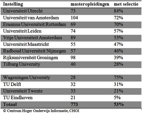 Steeds meer masteropleidingen willen alleen de beste studenten verwelkomen, blijkt uit onderzoek van de Keuzegids Masters. De Universiteit Utrecht is het meest selectief: 84 procent van de masteropleiding heeft een toelatingsprocedure. Ook de Universiteit van Amsterdam en de Erasmus Universiteit Rotterdam stellen vaak extra eisen.