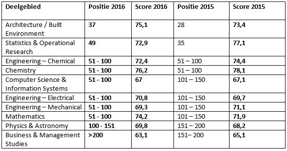 De TU/e is bezig aan een opmars in de 'QS World University Rankings 2016 by subject'. Van de tien onderzochte vakgebieden zijn er dit jaar vijf hoger op de lijst terug te vinden. Acht vakgebieden van de TU/e behoren daarmee tot de honderd besten ter wereld. De QS Intelligence Unit beoordeelde 4.226 universiteiten wereldwijd - ruim 700 meer dan in 2015.