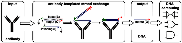 Onlangs publiceerde Merkx met zijn promovendus Wouter Engelen en collega’s van Computational Biology een artikel in vakblad Nature Communications, waarin ze laten zien dat ze antilichamen -moleculen die we aanmaken tegen ziekteverwekkers - als input kunnen gebruiken voor een DNA-computer. “Het antilichaam heeft een zodanige vorm dat het twee DNA-moleculen bij elkaar kan brengen”, legt Merkx uit. “Hierdoor kunnen die twee moleculen samen reageren, waarbij weer een nieuw stuk DNA vrijkomt dat in afwezigheid van het antilichaam niet zou worden gevormd.” In de studie laten ze hun DNA-computer in een volgende stap een fluorescerend molecuul maken, waarmee de aanwezigheid van het antilichaam letterlijk zichtbaar wordt. Daarnaast kan de DNA-computer ook signalen versterken en logische operaties uitvoeren met meerdere verschillende antilichamen als input.