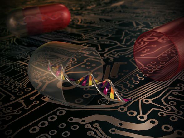 Dat DNA de drager is van onze erfelijke informatie, is al sinds de jaren vijftig van de vorige eeuw bekend. De laatste jaren wordt echter steeds duidelijker dat dit wonderbaarlijke molecuul ook een handig gereedschap kan zijn voor ingenieurs. Op basis van DNA kun je zelfs een soort computers maken. Men is er al in geslaagd om met zo’n DNA-computer wortel te trekken, maar dat kost nu nog veel tijd. Hoewel de mogelijkheden in theorie eindeloos lijken - zo zou een liter vloeistof met zes gram DNA een geheugencapaciteit hebben van een paar zettabyte (duizend miljard miljard bytes), en kun je met DNA mogelijk gigantisch snel parallel rekenen -, ligt het daarom toch niet voor de hand dat DNA-computers snel een concurrent worden voor de computers die we al kennen.