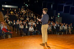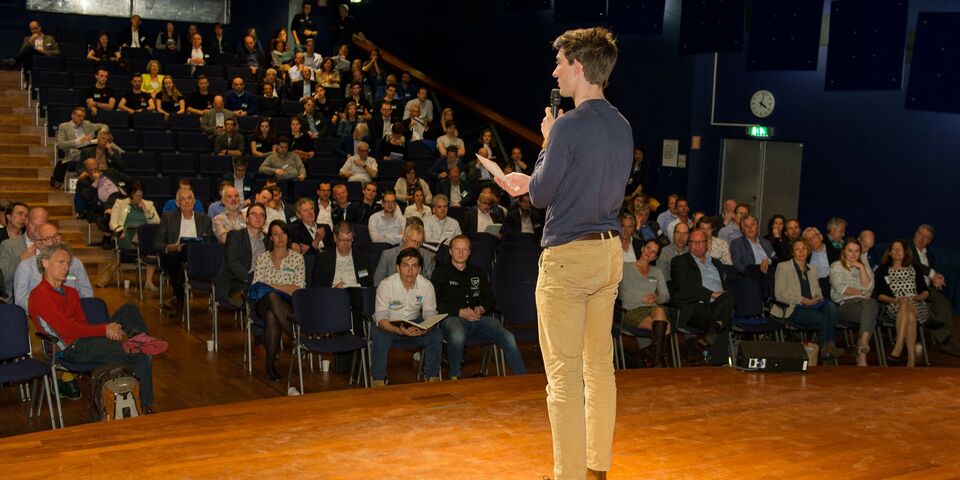 De eerste spreker in de Blauwe Zaal was Rianne Valkenburg, mede-eigenaar van TU/e Lighthouse, een non-profitorganisatie die kennis over intelligente verlichting en slimme steden beschikbaar maakt voor de samenleving. Zij benadrukte het belang van ‘living labs’, onderzoeksomgevingen waar wetenschappers hun ideeën aan praktijktests kunnen onderwerpen, in samenwerking met bedrijven en consumenten. De studententeams van de TU/e vormen dergelijke living labs, zo hield ze de bezoekers – grotendeels uit het bedrijfsleven – voor.