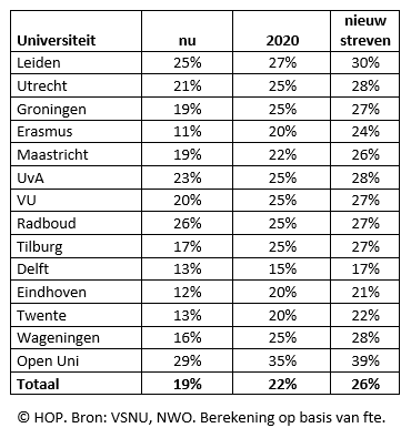 Alleen zitten er geen consequenties aan die streefcijfers. In principe zouden de universiteiten in 2020 hun schouders kunnen ophalen en zeggen: we hebben het echt geprobeerd, maar het lukte niet.