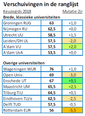 De Universiteit Twente maakt juist een aanzienlijke sprong omhoog: daar groeit het aantal studenten minder extreem en dat lijkt zich te vertalen in een derde plek in de overall score. In de ranglijst van beste TU’s staat Twente (67) nu tweede achter Wageningen (76). Eindhoven (62,5) en Delft (57,5) volgen.
