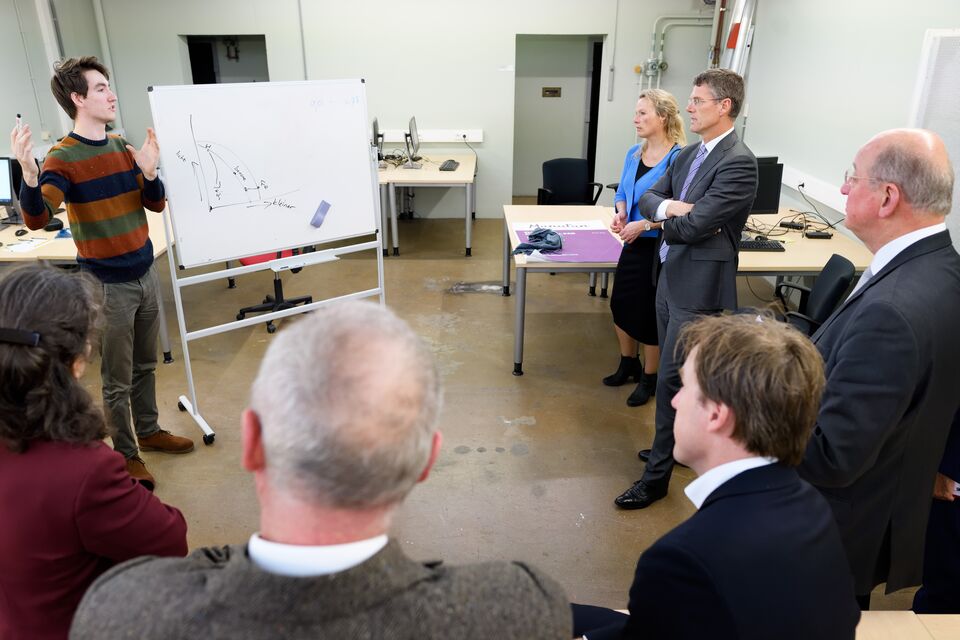 In de TU/e innovation Space kreeg Duisenberg aansluitend van Luc Brinkman van Team Solid uitleg over hun onderzoek naar het inzetten van metaal als duurzame energiedrager. En in Ceres praatte hoogleraar Jan van Hest hem bij over diens eigen onderzoek en, in bredere zin, over de richting die de TU/e op wil gaan met haar onderzoek de komende jaren. Van Hest is voorzitter van de studiegroep die zich daarmee bezighoudt.