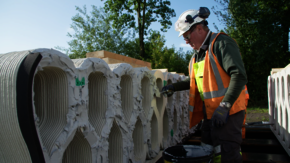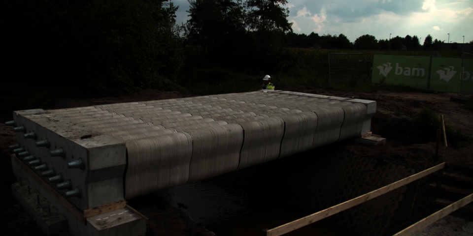 Voorafgaand aan het printen van de ‘fullsize’ brug is afgelopen voorjaar eerst een schaalmodel (1:2) gemaakt. Toen die bestand bleek tegen een belasting van tweeduizend kilo, is halverwege juni begonnen met het printen van de betonnen elementen, die nu op locatie door bouwbedrijf BAM Infra aan elkaar zijn gelijmd om de zeven meter lange brug te vormen.