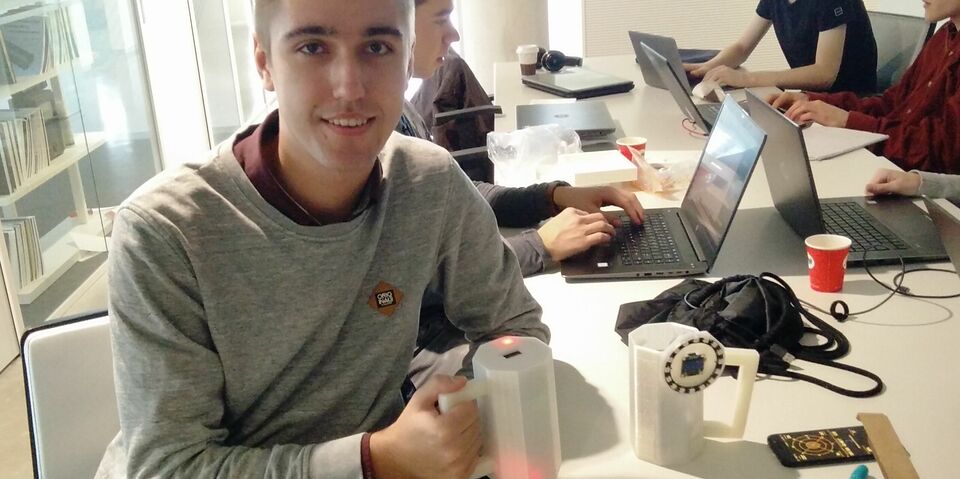 Arthur Timmermans, student Electrical Engineering, (zie foto) bouwde met zijn groepje twee controllers in de vorm van een bierpul. Omdat de presentatie in een ruimte op vloer tien was, kwam er een videoverbinding aan te pas om de werking te demonstreren. Met de bierpul in de hand liep een student naar de plekken waar ‘iets te happen was’ of weg van plekken waar de vijand loerde. Dat zag hij aan verschillend gekleurde ledjes in de bierpul. “Het was heel leuk om de leerstof in de praktijk uit te voeren met levend Pacman.”