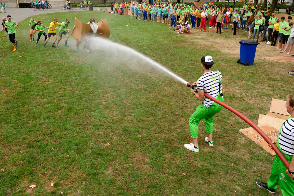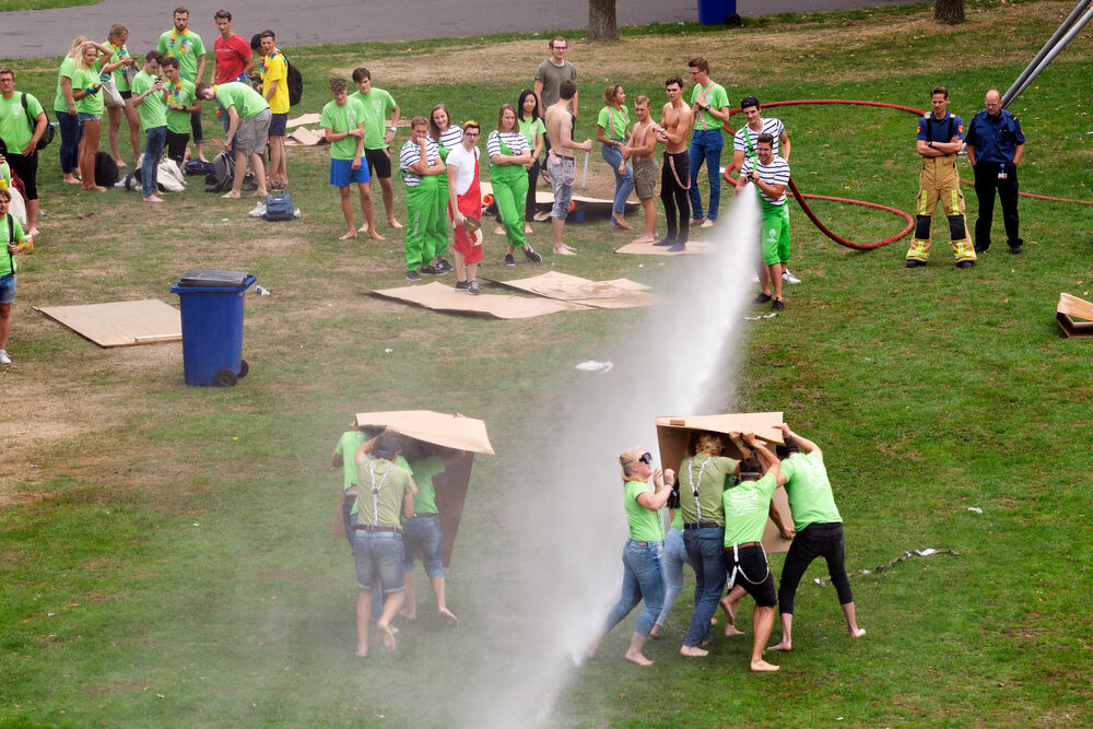 Blijf zo lang mogelijk standhouden tegen een brandweerspuit. Dat was de opdracht aan meer dan driehonderd aankomende Bouwkundestudenten. Je mag je winnaar voelen als je droog bent gebleven. Maar de ware winnaars van het Bouwkundespektakel zijn de nieuwe bestuursleden, “want die mogen spuiten”.
