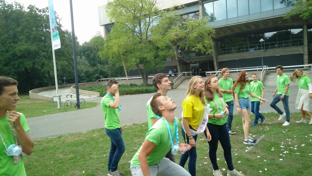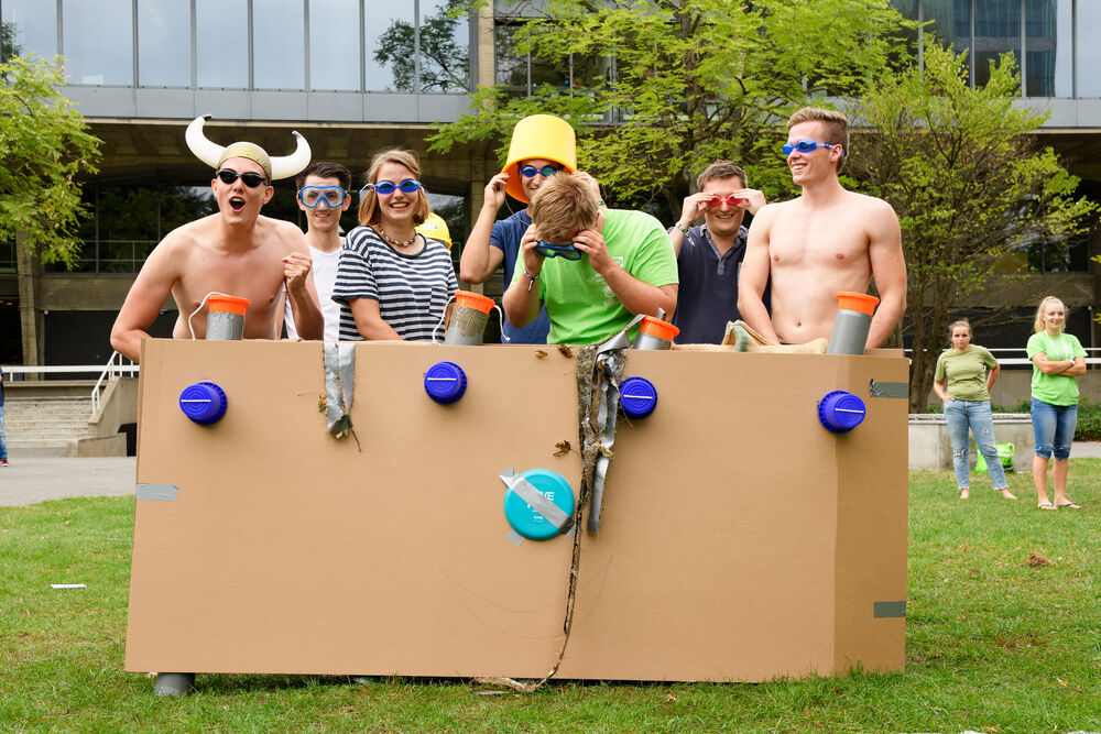 De CHEOPS-bestuursleden van komend collegejaar testen dertig bouwwerken. Papa Mark Geelhoed, wiens groepje 16 een best indrukwekkend uitziend dubbelwandig (!) schild knutselde, noemt hen de echte winnaars, omdat zij iedereen nat mogen spuiten. Maar er is geen ranglijst. Het gaat erom zo droog mogelijk te blijven.