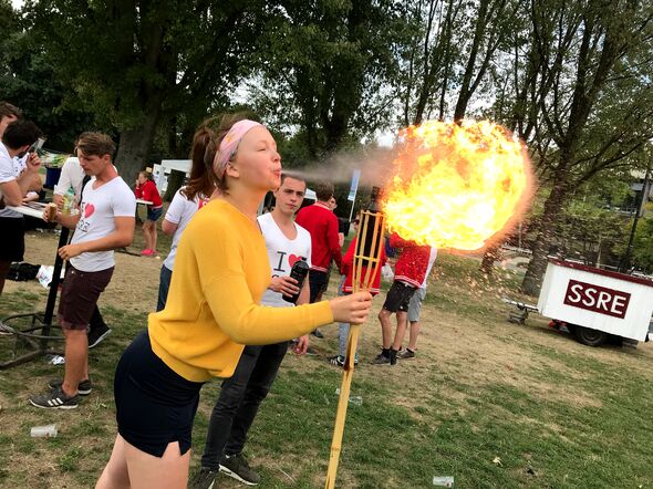 Bovendien zijn daar de mannen van studentenvereniging SSRE en die weten sowieso wat ze doen. Vooral de mannen van Het Vikingendispuut Ragnarøk, waar bij gelegenheid (lees: feest) ballonnen aan een muur worden gehangen om ze vervolgens al spuwend kapot te vlammen.