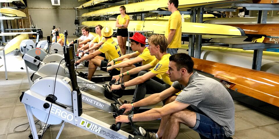 Maar eerst moet er bínnen worden gezwoegd. Zweetdruppels parelen langs de slapen bij verschillende introkids die zich proberen te bewijzen (of een halfslachtige poging daartoe doen) op de ergometers van Thêta. Driehonderd meter moeten ze, racend tegen hun groepsgenoten, afleggen; wie dat ook nog eens binnen een bepaalde tijd voor elkaar krijgt (51 seconden voor mannen, 1 minuut 2 voor vrouwen) wordt beloond met zes weken gratis lidmaatschap. “Talent leggen we extra in de watten”, vertelt Johann Slabber van de vereniging lachend.