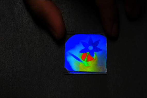 Het lijkt een eenvoudig blauw oppervlak. Maar adem erop of voeg water toe en plots verschijnt een felkleurige bloem. Onderzoekers van de TU/e ontwikkelden dit ‘schilderij’ dat van kleur verandert onder invloed van vocht. De ‘truc’ is dat licht een bepaalde kleur heeft als het weerkaatst op microscopische gelaagde structuren. Door het vocht zet het gelaagde materiaal uit en ontstaat een andere kleur. Toepassingen zijn talloos, variërend van verpakkingen, huizen, auto’s of van kleur veranderende decoraties, maar bijvoorbeeld ook echtheidskenmerken op bankbiljetten.