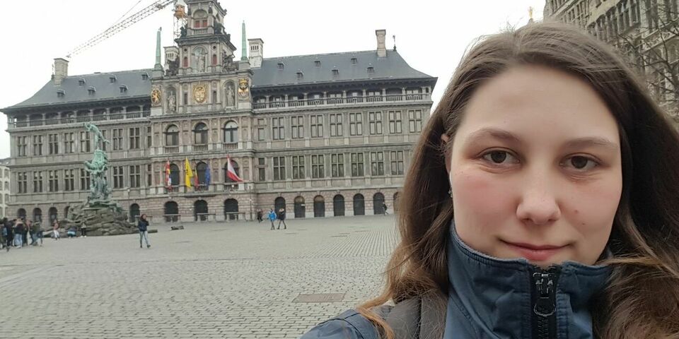 Op de foto staat Sharon bij het stadhuis van Antwerpen. "Het standbeeld ervoor verbeeldt de oorsprong van de naam van de stad: hand-werpen."