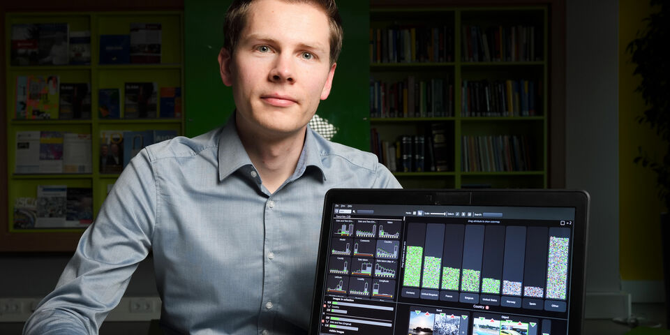 Daarnaast ontwikkelde Van der Corput ook een applicatie om meerdere beeldcollecties met elkaar te vergelijken: PICTuReVis. Dat programma testte hij met alle afbeeldingen van fotodeelsite Flickr die aantoonbaar in 2015 in Nederland waren gemaakt – een half miljoen foto’s van zo’n tienduizend verschillende makers. Hij laat zien hoe de applicatie hem in een oogwenk toont welke foto’s van een bepaalde persoon afkomstig zijn, en dat het aantal foto’s in de vakantieperiodes piekt. Vervolgens selecteert hij een aantal trefwoorden die gerelateerd zijn aan het thema ‘zeilen’ en laat zien dat deze grotendeel zijn gemaakt op een paar dagen in augustus, en in Amsterdam. “Sail Amsterdam 2015”, verklaart hij niet zonder trots.