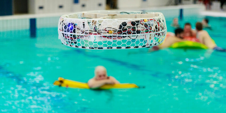 Blue Jay is zijn nieuwe systeem volop aan het testen in verschillende zwembaden in de buurt, waaronder in het Studentensportcentrum. Daarbij bleek ook het autonoom laten vliegen van de drone boven water een uitdaging. “De drone heeft een vaste ondergrond nodig op basis waarvan hij zijn hoogte bepaalt. Water reflecteert, dus we wilden al vrij snel boven water gaan vliegen om te onderzoeken of hij de bodem van het zwembad als ondergrond zou pakken, het wateroppervlak, of iets daartussenin. We zijn begonnen met het opzetten van een kinderzwembadje in onze testruimte en toen we zeker wisten dat de drone het wateroppervlak detecteerde, was het tijd voor de volgende stap: een echt zwembad.”