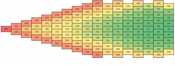 De luchtweerstand voor elk van de 121 renners in een wielerpeloton, als percentage van de luchtweerstand van een renner die alleen rijdt.