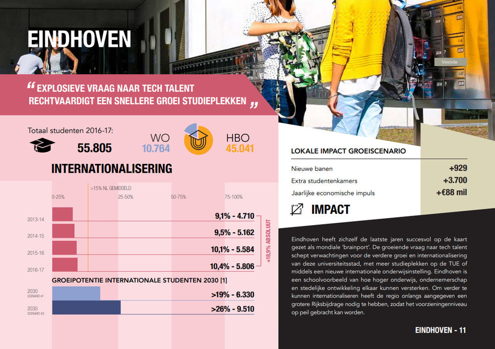 Voor Eindhoven is de economische impact aanzienlijk minder: 88 miljoen euro. Volgens de onderzoekers komt dit omdat de meeste opleidingen in het hbo nog niet Engelstalig zijn, waardoor de groei van het aantal internationale studenten relatief bescheiden blijft. In het meest gunstige scenario stijgt dat aantal van 5.806 in het collegejaar 2016-2017 naar 9.510 in 2030. In Enschede bijvoorbeeld verwachten de onderzoekers een aanzienlijk sterkere groei: van 4.623 naar 11.440 internationale studenten. Daar komt de jaarlijkse impact dan ook uit op 161 miljoen euro.