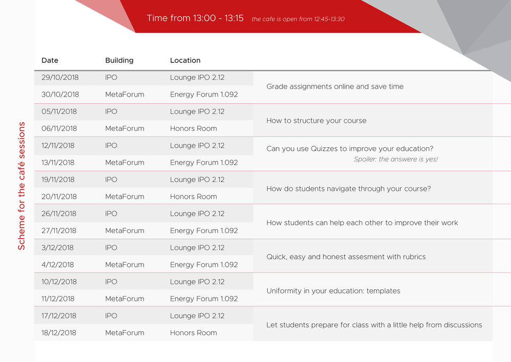De inloopsessies zijn elke maandag in het IPO-gebouw en op dinsdag in het MetaForum, beide dagen van 13.00 tot 13.15 uur. Het café is open van 12.45 tot 13.30 uur. In IPO is het elke keer in de Lounge (2.12) en in MF meestal in het Energy Forum (1.092). Zie onderstaand schema (klik voor een vergroting).