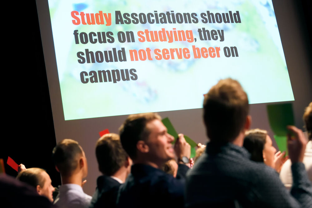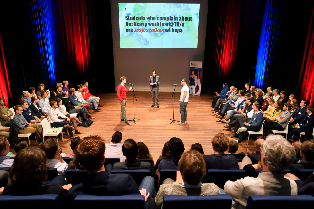 Al bij de eerste van de 29 te bespreken stellingen, grapt debatleider Carlo van de Weijer (directeur van TU/e’s strategic area Smart Mobility) dat de Engelstaligheid nog in transition is. Er staat: ‘Students who complain about the heavy work load @TU/e are zesjescultuur whimps.’ De stellingen zijn in vier categorieën verdeeld: work load, diversity and inclusiveness, internationalization and language en alcohol united. Wanneer de overgrote meerderheid het eens is, bijvoorbeeld bij de vraag of het CvB regels moet opstellen om spreekkoren te verbieden (“nee!”) of de studieverenigingen moet verplichten om dertig procent internationals op te nemen (“nee!”) vraagt Van de Weijer of mensen omwille van het debat, toch een tegenovergestelde mening willen verdedigen. Dat gebeurt maar mondjesmaat.