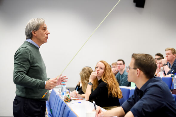 Al in de eerste vijf minuten onderbreekt hij zichzelf. “Hee, hee, hee” - hij wijst met zijn aanwijsstok naar een student. “Yellow card.” Die student kijkt de komende twee uren niet meer op zijn telefoon. En Meijer hoeft geen enkele keer weer om orde te vragen.