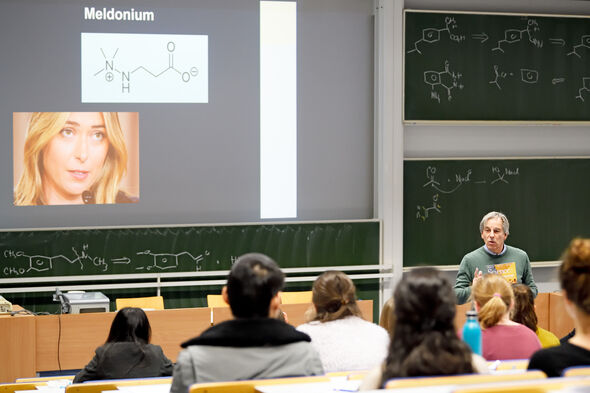 En dan is het tijd voor weer een intermezzo. Studenten herkennen tennisster Maria Sharapova. Ze is beschuldigd van gebruik van meldonium, maar inmiddels weer terug op de tennisbaan. Meldonium is een voorbeeld van retro-synthese. Het staat in de meest recente New Scientist. “Dat moet je lezen! Daar maken Ghislaine Vantomme en ik duidelijk hoe je niet-covalente synthese moet aanpakken - een paradigmashift wordt door ons voorgesteld. Hoe zou je ooit leven in een lab kunnen maken? Deze week verschijnt dat ook in Science.”