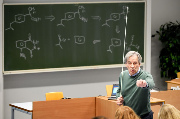 De professor met de Nagoya Gold Medal of Organic Chemistry op zak stopt actualiteit in zijn college. “Ik zag dit weekend op het NOS-nieuws dat aan het traangas dat de politie in Parijs gebruikt een moleculenspray is toegevoegd. Met uv-stralen zijn de moleculen een week later nog te zien op de relschoppers, zelfs als de haren gewassen zijn. Dit wordt ook gebruikt in hele dure winkels.”