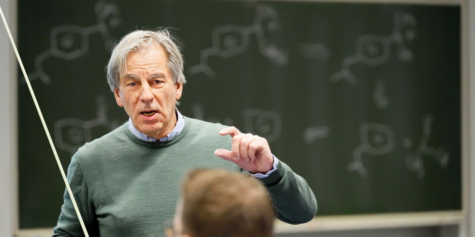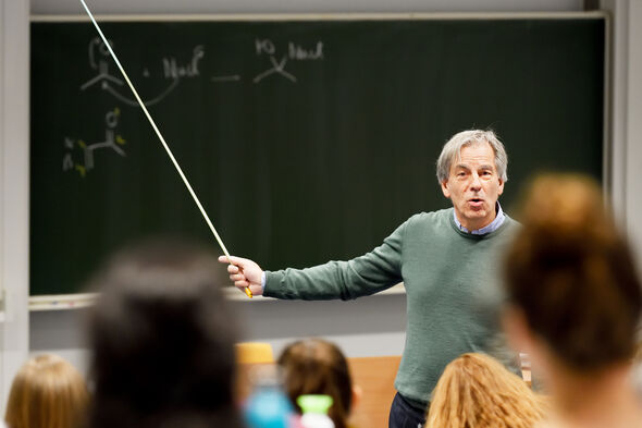 De studenten (ongeveer tachtig tweede- en derdejaars scheikundestudenten, een enkele BMT’er) zijn op tijd binnen, want Bert Meijer begint om 9.45 uur sharp. Ze pakken er geen laptop bij, maar pen en papier. Het is het twaalfde college over organische chemie. “Gewoon een basisvak, maar wel een van de mooiste basisvakken in de chemie”, volgens Meijer.