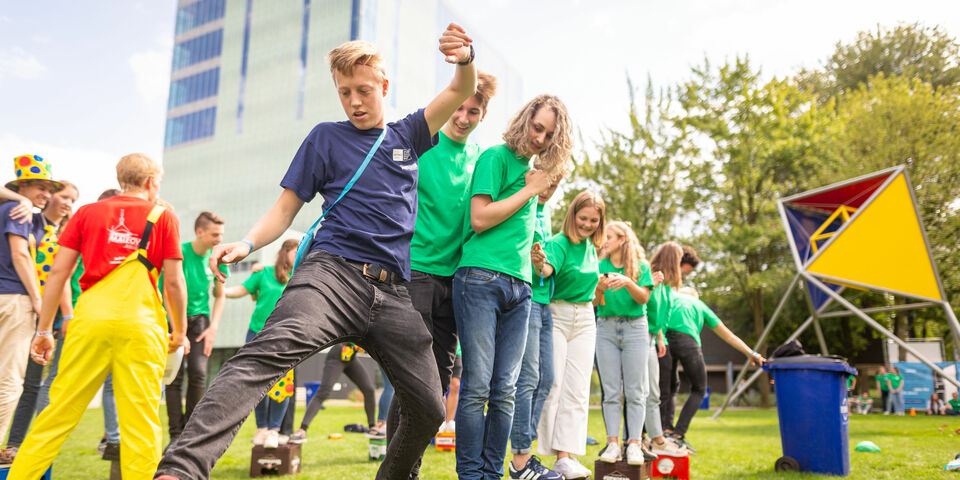 De tweehonderd bouwkundigen-to-be kunnen in vijftien spellen punten verdienen om bouwmaterialen te kopen voor het grote bluswaterstraalontloopspel in samenwerking met de brandweer. Brugbouwen met bierkratten, memory met foto’s van gebouwen en docenten en met hun lijf de woorden ‘steel’, ‘study’ en ‘week’ leggen, zijn volgens de introcommissie van CHEOPS studiegerelateerd genoeg.