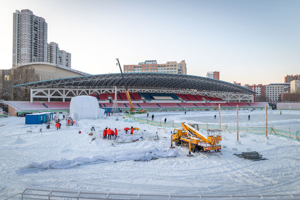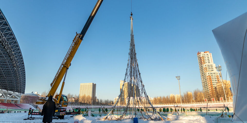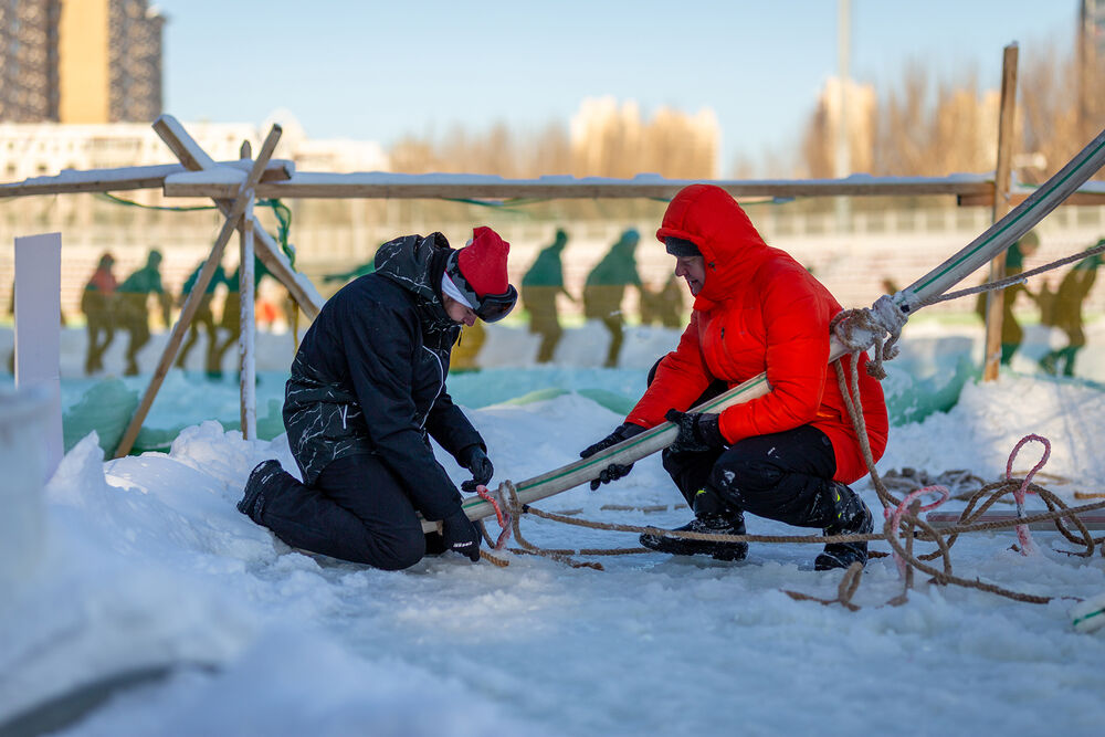 Maandag 16 december kwam de temperatuur in Harbin nog gevaarlijk dicht bij 0 graden Celsius, aldus Pronk, wat het dichtvriezen van de funderingsplaat, en daarmee ook de ankerpunten, bemoeilijkte. Uiteindelijk konden in de nacht van 16 op 17 december de brandslangen en de complexe touwstructuur toch omhoog worden getakeld. Volgens Pronk staat het geheel nu koeltjes te bevriezen in afwachting van de afwerking.