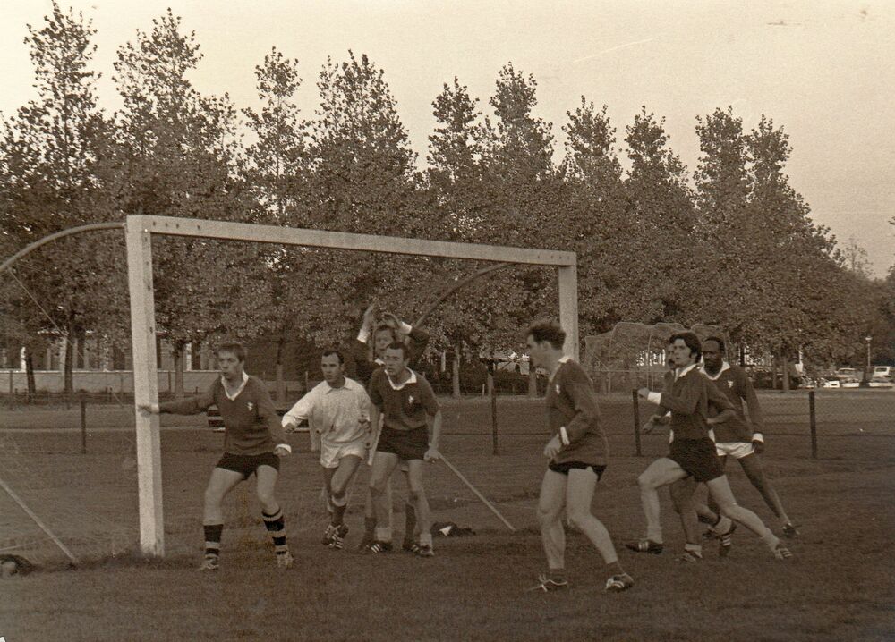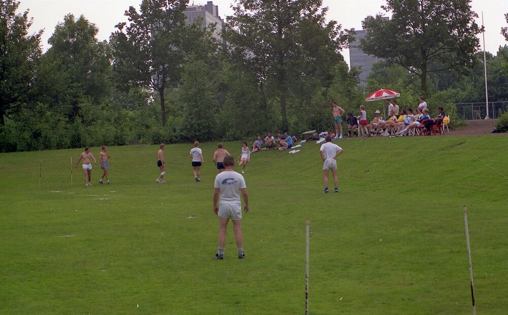“Waar nu de tennisvelden zijn, was vroeger een kuil met een grasveld - aangelegd om er te tennissen op gras. Maar daarvoor is de kuil nooit gebruikt, want het veld was niet goed genoeg om een tennisbal te laten stuiten. Wel om er te voetballen, áls het niet onder water stond”, zegt Van de Ven. “We gingen dan eerst trimmen en vroegen na afloop een bal te leen bij het sportcentrum.” Voetbalden jullie onder werktijd? “Ons decreet was: als de dienst het toeliet, dan konden we voetballen. En de dienst liet het eigenlijk altijd toe. Dat mag je nu wel opschrijven, wij zijn toch met pensioen. Och, de vrijheid die wij hebben gehad…”