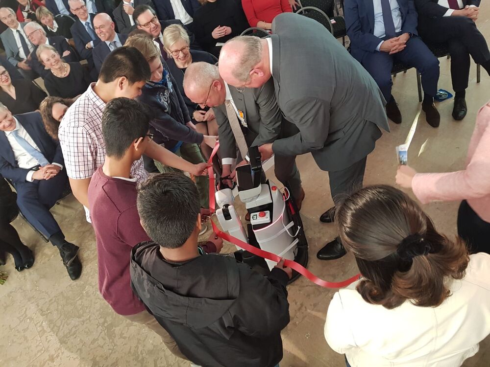 De burgemeester van Meierijstad, Kees van Rooij, was gisteren aanwezig in Atlas om aan scheidend vicevoorzitter Jo van Ham de versierselen uit te reiken die horen bij de Koninklijke onderscheiding tot Ridder in de Orde van Oranje-Nassau. Van Ham zei overvallen en geroerd te zijn door alle mooie woorden. Bij de opening van Atlas moest hij toch nog bijspringen om het doorknippen van het lint over te nemen van de vastgelopen zorgrobot Hero.