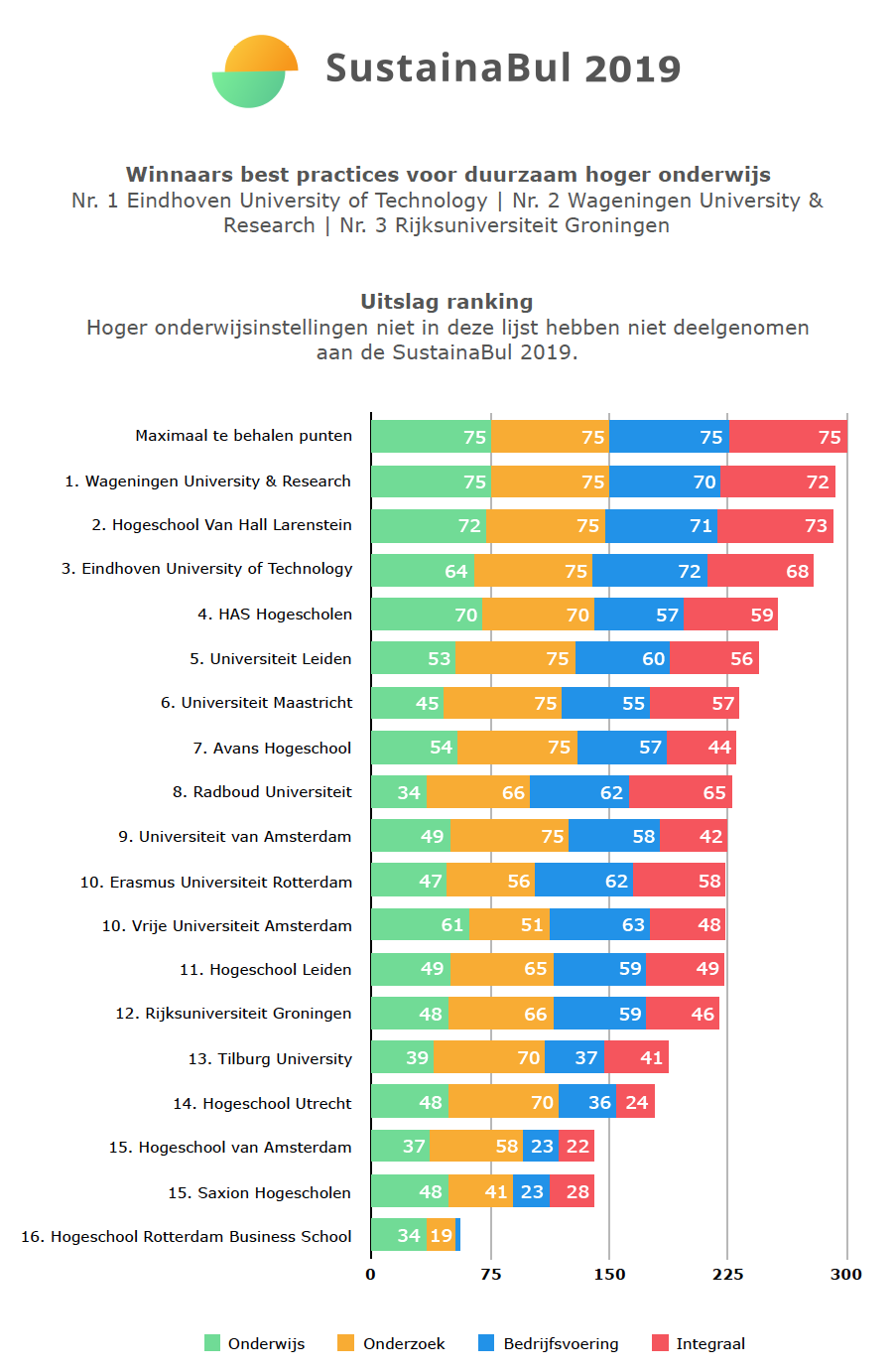 Het studentennetwerk voor duurzaamheid in het hoger onderwijs, Studenten voor Morgen, reikte afgelopen vrijdag voor de zevende keer de SustainaBul uit. Tien universiteiten en acht hogescholen werden beoordeeld op de thema’s onderwijs, onderzoek, bedrijfsvoering en ‘integrale benadering’. De instellingen vulden een vragenlijst in, waarna de studenten punten gaven op grond van de antwoorden en bewijsstukken.