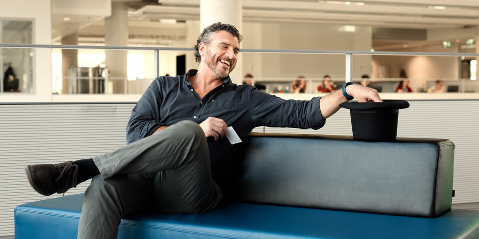 Ramiro Serra (45), universitair docent bij de Electrical Energy Systems Group, trekt vijf kaartjes uit de hoge hoed en legt ze voor zich neer. Bedachtzaam bekijkt hij de vragen en vervalt in stilte. “Dit zijn moeilijke vragen.” Hardop in zichzelf: “De meeste vragen zijn voor meerdere antwoorden interpreteerbaar, waar ben je naar op zoek?” Al snel wisselt hij de vraag ‘Waar ben je onzeker over’ in. “Dat zijn er teveel om op te noemen. Voer voor psychologen, zegt hij met een glimlach.
