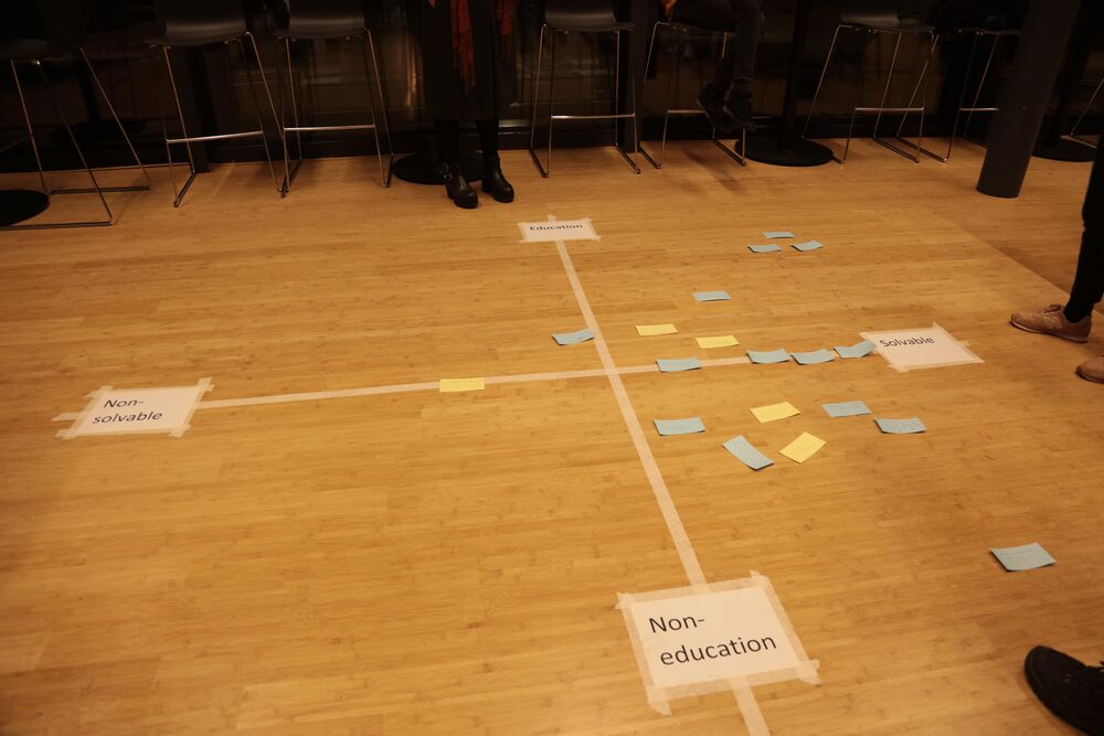 Op de grond staat een groot kruis: op de x-as de studiegerelateerde versus niet-studiegerelateerde problemen en op de y-as de oplosbare versus niet-oplosbare issues. De kaartjes met uitdagingen mogen door de studenten op de voor hun best passende plek worden gelegd. Gelukkig plaatsen weinig betrokkenen klachten richting de niet-oplosbare uithoek. Een kwart blijkt studiegerelateerd, een kwart niet en de helft zit precies op de middellijn.