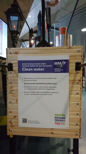 De tentoonstelling reist het komende halfjaar over de campus en zal daarna ook tijdens open dagen worden ingezet, vertelt hoogleraar Kitty Nijmeijer van MM/P donderdagochtend tijdens de bescheiden openingsplechtigheid van de Polymer Membranes Roadshow. Belangstellenden kunnen zelf met een handpomp ‘grondwater’ door een zuiverend membraan pompen, en via een kraantje een bekertje vullen met drinkwater - een handeling die door Nijmeijer met haar collega Zandrie Borneman voor de gelegenheid wordt gedemonstreerd. De membranen in de opstelling worden wereldwijd op grote schaal toegepast voor de productie van drinkwater uit grond- en oppervlaktewater.
