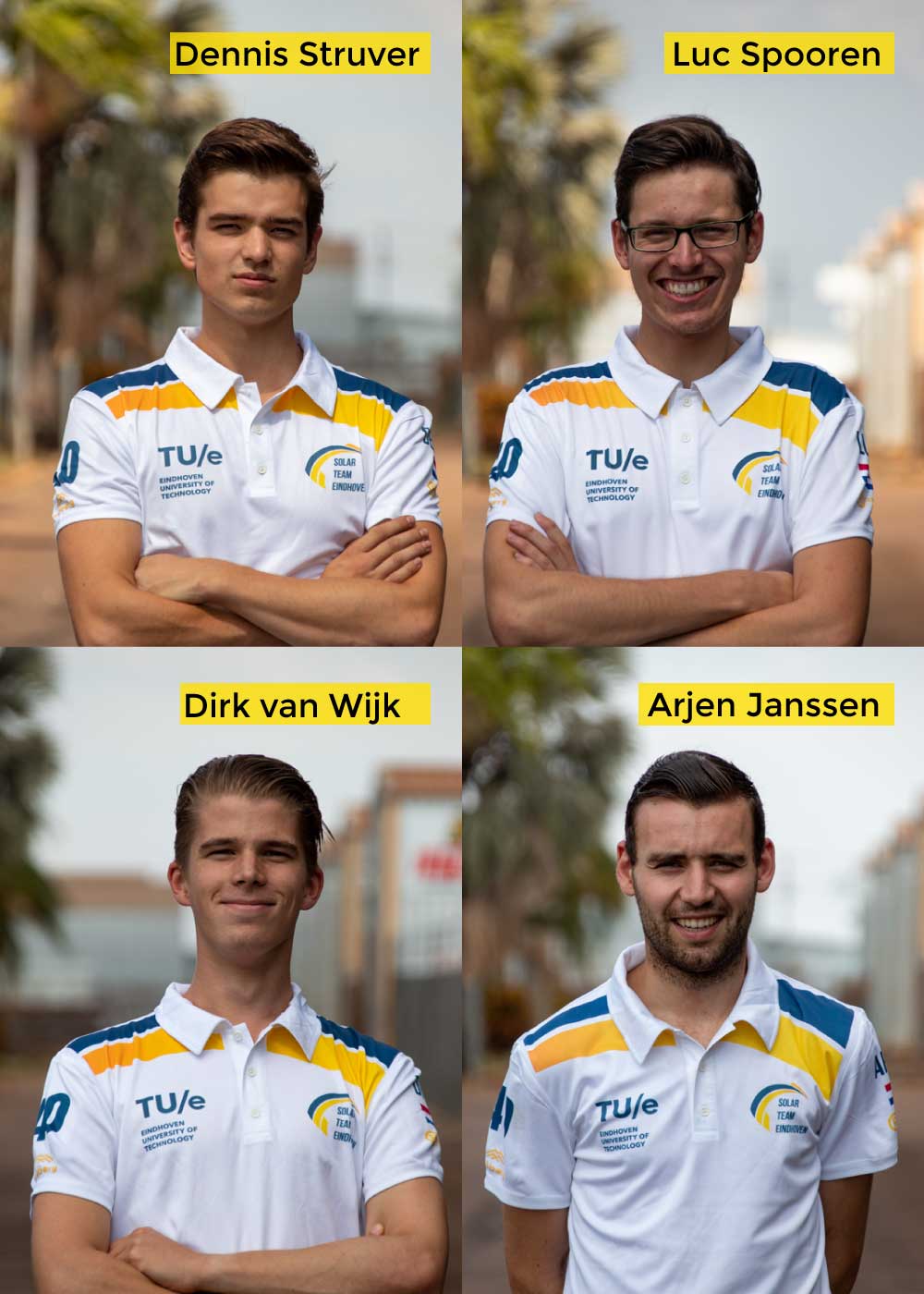 Het 26-koppige TU/e-team (onder wie vier bestuurders voor Stella Era, zie foto rechts) wordt gedurende het traject vergezeld door zo’n dertien gasten - onder hen zijn alumni uit voorgaande teams, vertegenwoordigers van de universiteit en een mediateam. Laatstgenoemd team zorgt onder andere voor dagelijkse video-updates vanuit ‘down under’, te volgen via de eigen online kanalen van Solar Team Eindhoven.