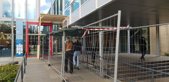 Camelot heeft intussen overkappingen gebouwd om de doorgang van en naar Luna veiliger te maken (zie de foto hieronder). Het terras van Hubble is niet meer in gebruik. Deze oplossing is tijdelijk en wordt zo snel mogelijk weer opgeheven wanneer de oorzaak van de losgelaten strips is achterhaald. "We verwachten dat de resultaten hiervan op korte termijn beschikbaar zijn. We willen deze hekken geen maanden hebben staan. Ik hoop dat het binnen een aantal weken opgelost wordt”, zegt de Directeur Huisvesting.