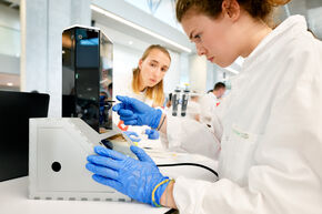 “Wij hebben een eiwit ontworpen dat bindt aan het geneesmiddel adalimumab. Om een lichtsignaal te kunnen ontvangen, is daarnaast een ander eiwitcomplex noodzakelijk. Dat bestaande eiwit hebben we gevonden en met deze drie-eenheid krijgen we nu een blauw lichtsignaal dat afhankelijk is van de concentratie medicijn”, begint Blijke Wessels (student Biomedische Technologie) de uitleg. Haar teamgenoten zijn bezig met het uitvoeren van de tests die bij deze competitie horen. Ieder team krijgt vierentwintig monsters waarvan ze zo nauwkeurig mogelijk de concentratie adalimumab moeten bepalen. Alle resultaten zijn live te zien op een scherm in Atlas. Iedere test duurt ongeveer vijf minuten.